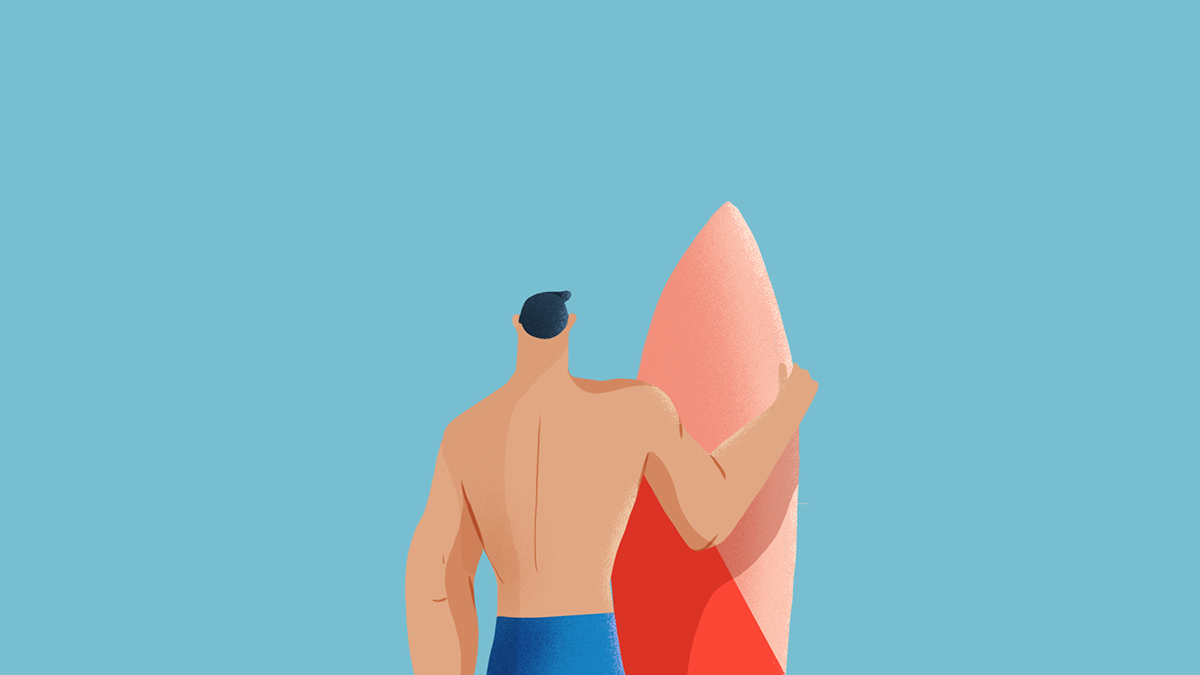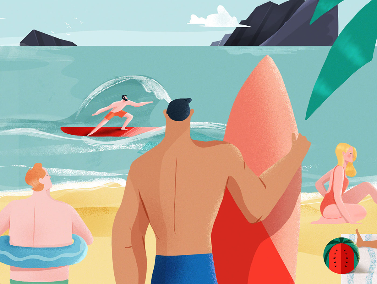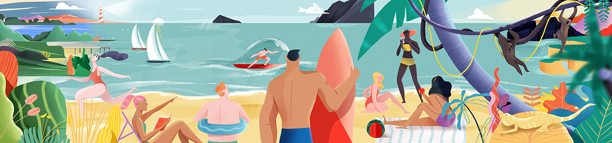 奋逗家族(fundog)每天会为您呈现丰富有趣的内容,例如:原创动漫IP、 动漫潮牌等。以下是来自以为美国的插画师绘制的海滩风景图,描绘的是一些在海滩上尽情游玩的游客们,有冲浪的、游泳的、日光浴的,到处的都是满眼的风景,一览无余。